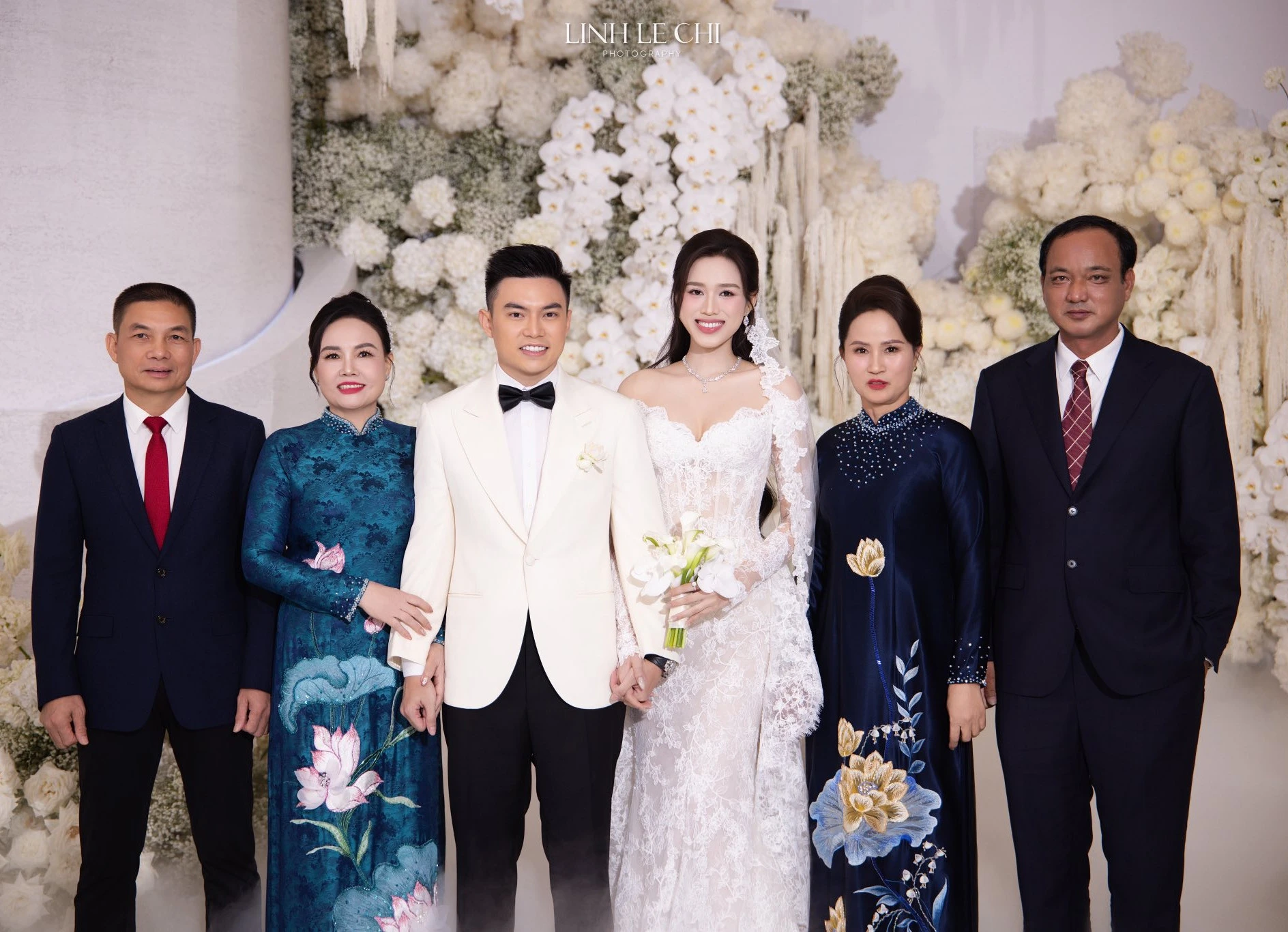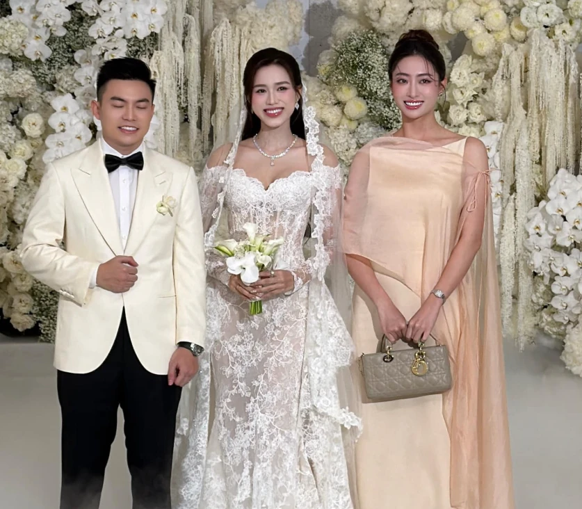 Trong ngày trọng đại, Đỗ Thị Hà xuất hiện lộng lẫy trong chiếc váy cưới ren trắng ôm sát, khoe trọn nhan sắc rạng ngời và vóc dáng chuẩn mực của Hoa hậu Thế giới Top 13. Chú rể Nguyễn Viết Vương cũng bảnh bao với suit trắng lịch lãm. Tuy nhiên, hai nhân vật khác lại gây chú ý không kém chính là bố mẹ chồng quyền lực của nàng hậu.