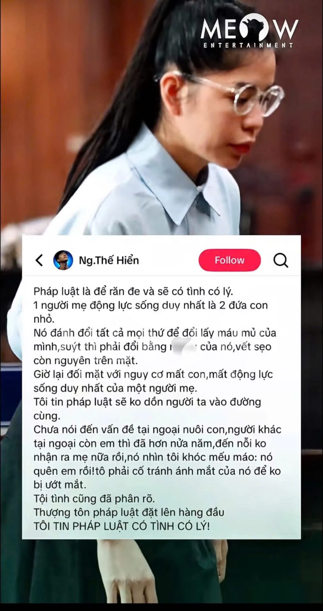 On his personal page, he wrote: "The law is to deter and will be reasonable. A mother's only motivation to live is her two young children. She traded everything to claim her own flesh and blood, almost had to trade it with her life, the scar is still on her face. Now she faces the risk of losing her children, losing the only motivation to live as a mother. I believe the law will not push people to the end of the road."