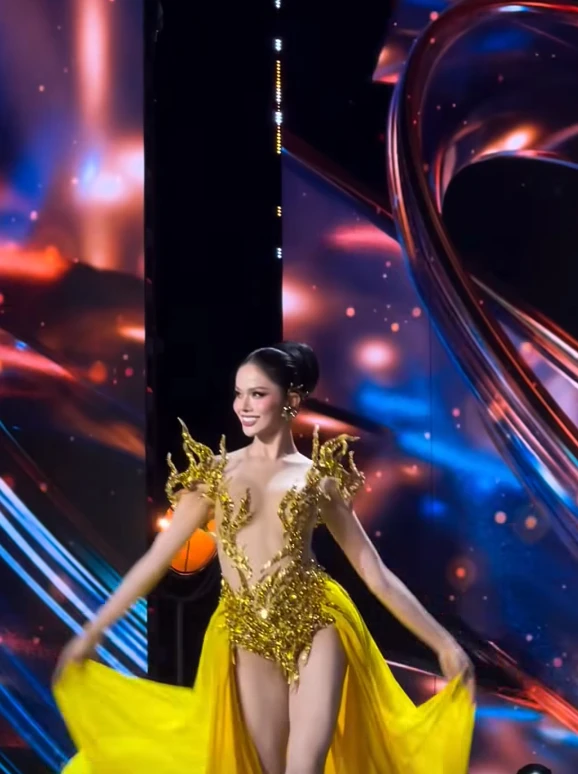 In the evening gown competition, Tam Nhu chose a bright yellow dress with a high slit, showing off her long legs and highlighting her elegant beauty. In particular, she skillfully used the technique of opening the skirt, turning each movement into an explosive stage moment. The Thai audience gave a lot of applause for the energetic performance of the Vietnamese representative.