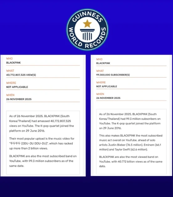 BLACKPINK set two Guinness World Records on YouTube, solidifying their position as a global girl group. With 99.3 million subscribers and over 40.7 billion views, BLACKPINK's appeal remains strong after nearly 10 years of activity.
