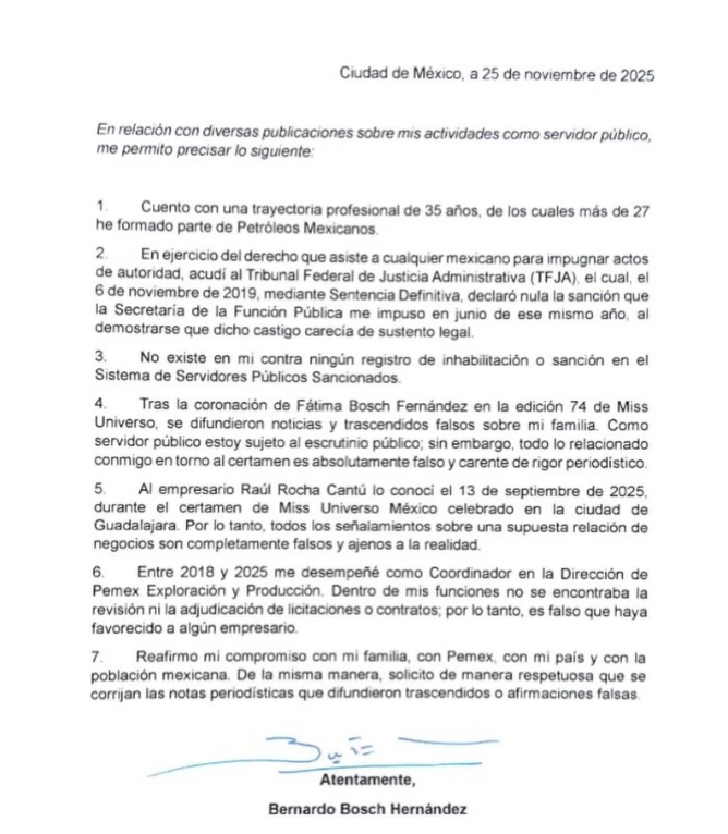 Để chứng minh sự trong sạch của mình, ông Bernardo Bosch đã làm rõ vị trí và trách nhiệm của mình tại tập đoàn dầu khí quốc gia Pemex. Ông khẳng định: "Từ năm 2018 đến năm 2025, tôi giữ chức vụ điều phối viên tại Ban Thăm dò và Sản xuất của tập đoàn dầu khí Pemex. Nhiệm vụ của tôi không bao gồm việc xem xét hoặc trao thầu hợp đồng, do đó việc cho rằng tôi thiên vị bất kỳ doanh nhân nào là sai sự thật."