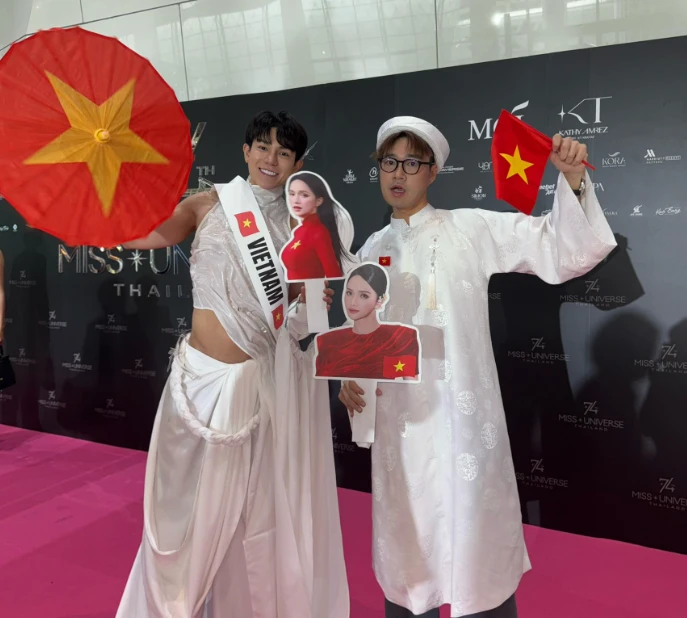 Not only Call Me Duy, the spirit of love and support for Huong Giang was also clearly shown through the large presence of Vietnamese fans in Thailand. Many audiences flew straight to Bangkok, carrying red flags with yellow stars and cheering banners, creating a warm "home field" right in the hotel lobby.