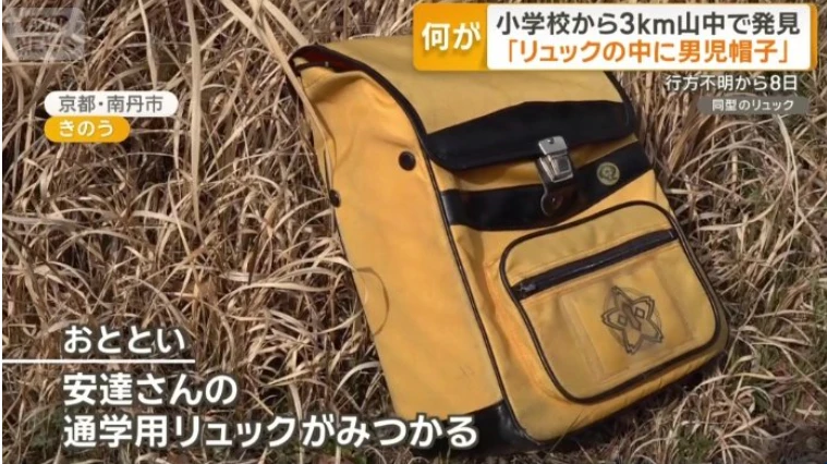 Ngay sau khi tiếp nhận tin báo, Cơ quan Cảnh sát tỉnh Kyoto triển khai tìm kiếm trên diện rộng. Đến ngày 25/3, thông tin nhận dạng của bé trai được công bố công khai, đồng thời phát lệnh tìm kiếm khẩn cấp. Manh mối đầu tiên xuất hiện vào sáng 29/3, khi người thân phát hiện chiếc ba lô màu vàng của bé trong một khu rừng thuộc địa bàn thành phố. Bên trong ba lô có khăn giữ ấm cổ và chiếc mũ màu vàng, trùng khớp với mô tả trước đó. Khu vực phát hiện nằm cách trường khoảng 3 km theo đường đi bộ và ở hướng ngược lại so với nhà của nạn nhân. Đây là khu vực thưa dân cư, xung quanh chủ yếu là rừng núi và đồng ruộng, làm dấy lên nghi vấn về việc đồ dùng bị bỏ lại có chủ ý.