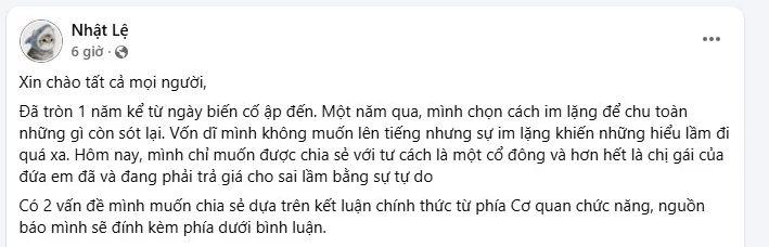 At the beginning of the article, Nhat Le shared that over the past year, when the incident hit, she chose to be silent to "take care of what was left". According to her, that time was not easy, as the family faced a lot of pressure and public opinion. This time she spoke out in two capacities, a shareholder of Sister Rod Group Joint Stock Company and a sister in the family.