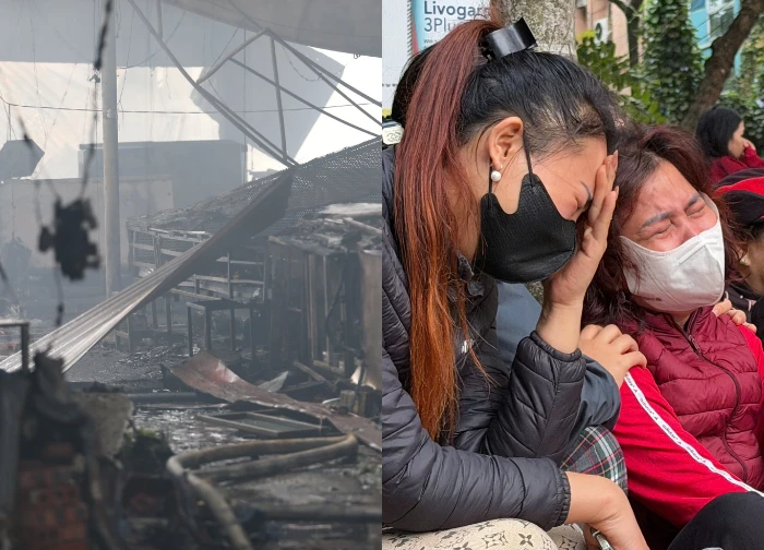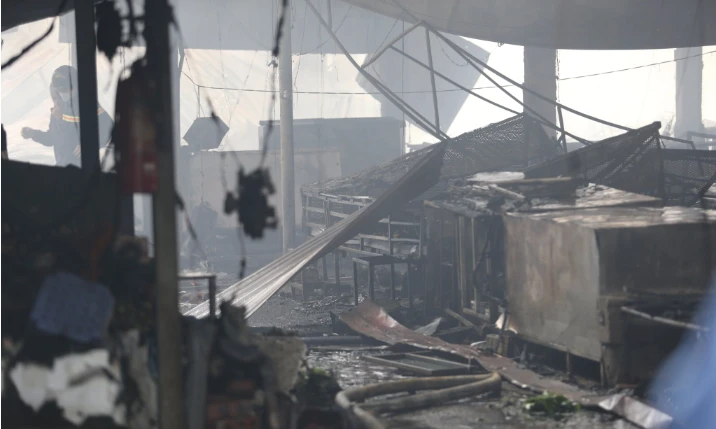 By around 7 am, the fire was largely under control. However, many smoldering spots remained inside the market, and the corrugated iron roof was heated, warped, and collapsed in several places. The sight of distorted iron frames, blackened stalls, and goods scattered throughout the walkways made the market space look desolate and heartbreaking.