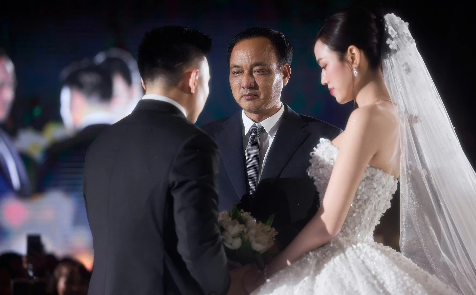 Trong suốt buổi lễ tại Quảng Trị, chú rể Viết Vương luôn gây chú ý khi bảnh bao, phong thái điềm đạm và liên tục có những hành động quan tâm dành cho Hoa hậu Đỗ Hà: theo sát, chỉnh váy, đỡ tay vợ di chuyển giữa không gian tiệc.