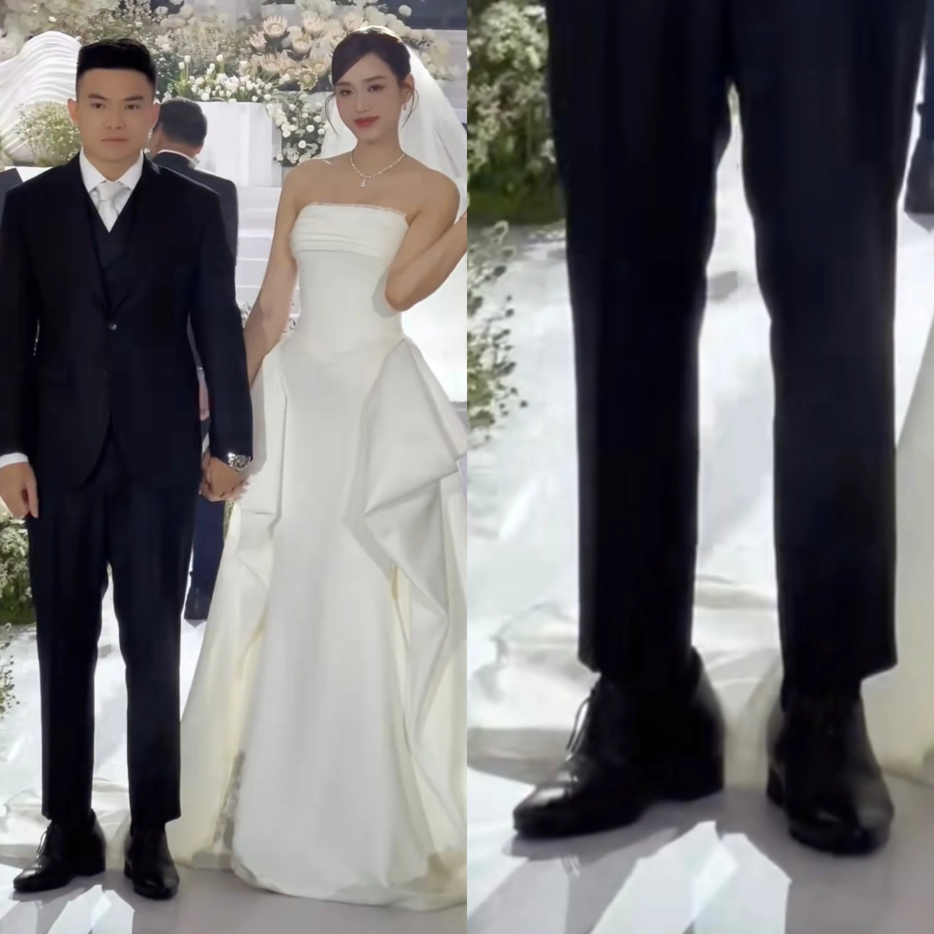 Tuy nhiên, sự chênh lệch chiều cao khi đứng cạnh cô vợ Hoa hậu Việt Nam 2020 đã khiến Viết Vương trở thành tâm điểm chú ý. Nhiều cư dân mạng đã tinh ý nhận ra dấu hiệu bất thường ở trang phục của nam thiếu gia: chiếc quần dài dường như đã bị kéo lên cao một cách ngắn ngủn, cho thấy anh có thể đã sử dụng thêm miếng độn giày hoặc loại giày tăng chiều cao đặc biệt để san bằng khoảng cách với vợ trong ngày trọng đại.