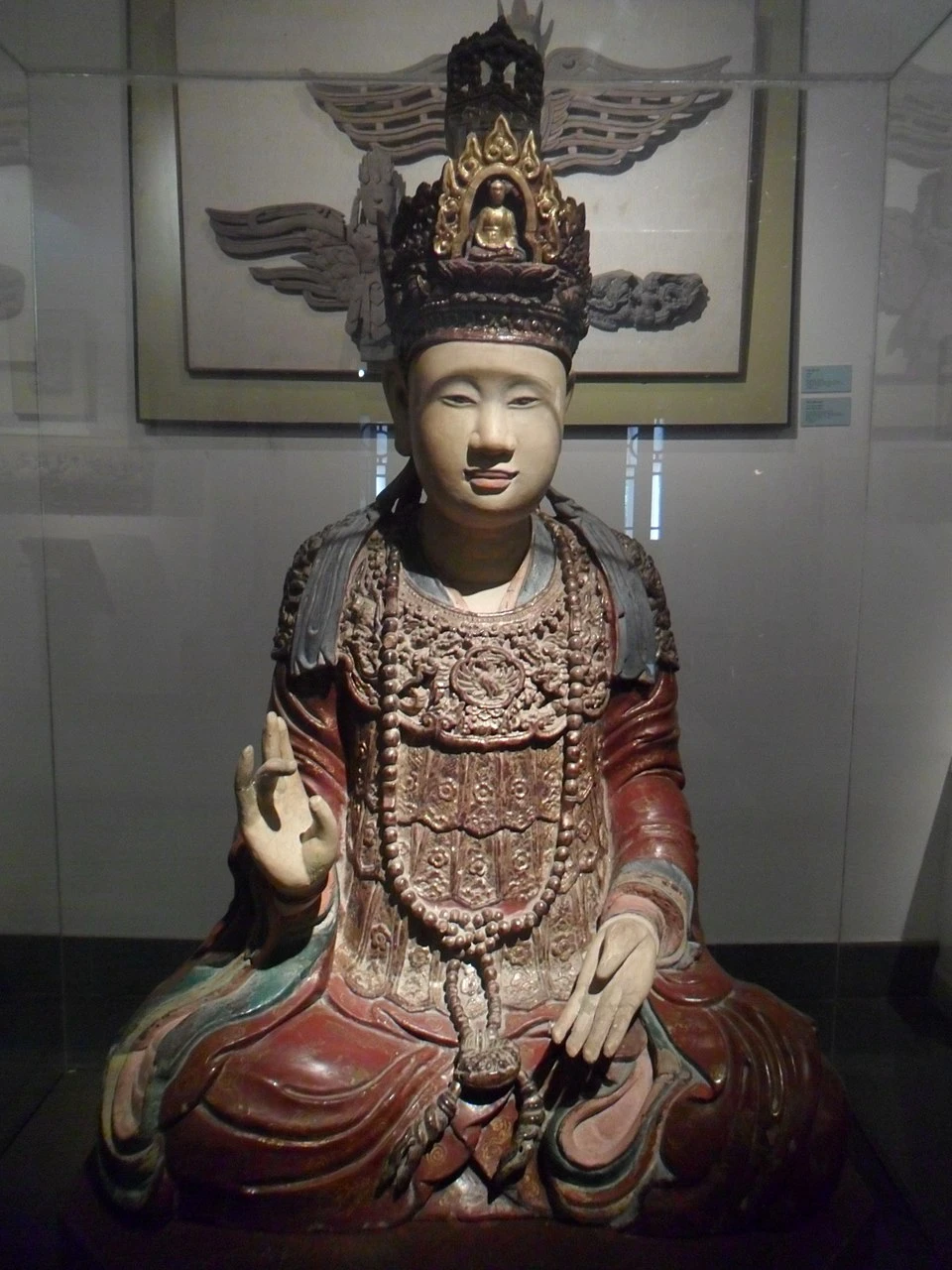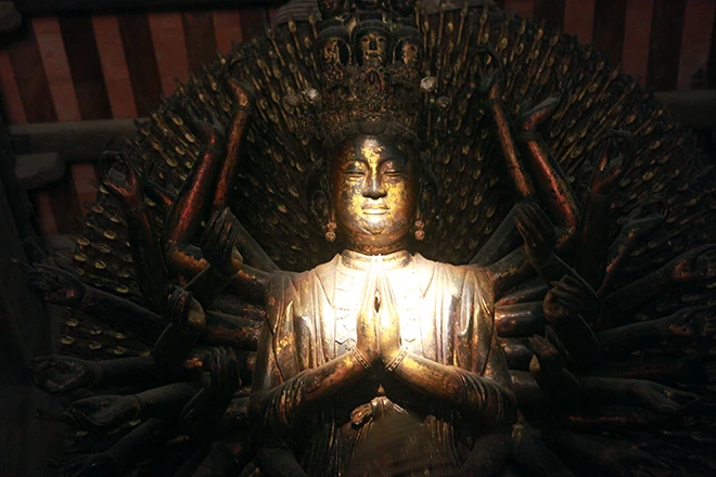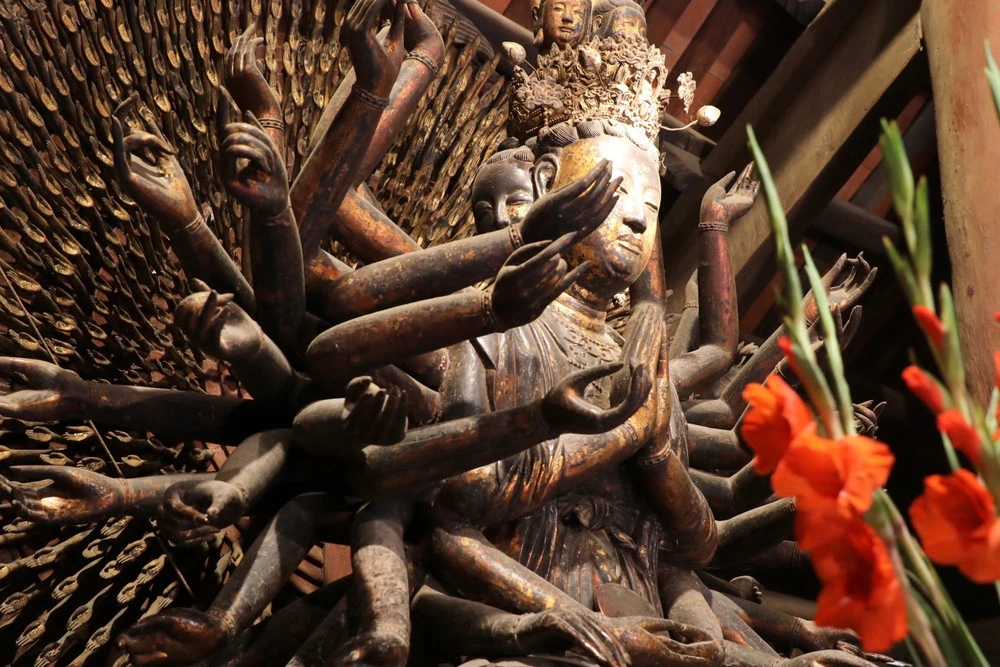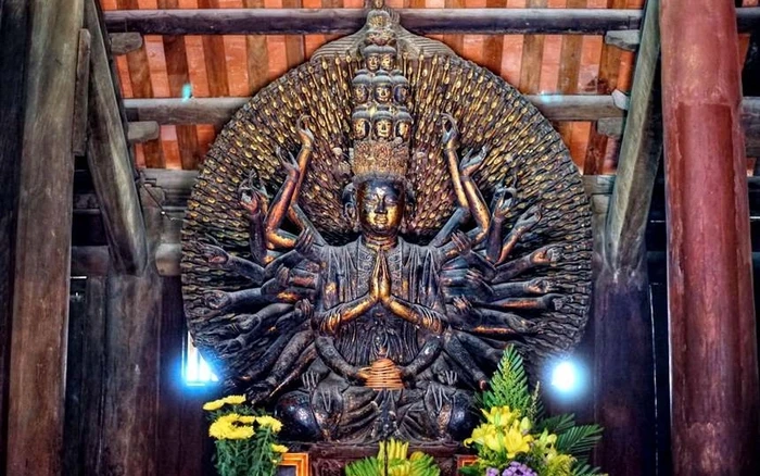 Pho tượng được đặt bên trái tòa Tam Thế trong thượng điện, cao 3,7m, rộng 2,1m và dày 1,15m. Toàn bộ cấu trúc làm bằng gỗ, có thể tháo rời thành 1.080 chi tiết mà không cần sử dụng chất kết dính. Trên đỉnh đầu Quan Âm là hình tượng Phật A Di Đà, gợi nhắc tích xưa: khi Quan Âm vì quá lo nghĩ cho chúng sinh mà đầu nổ tung thành nhiều mảnh, chính A Di Đà đã dùng phép nhiệm màu ghép lại, tạo thành 11 khuôn mặt và 42 cánh tay lớn. Những cánh tay để trần mềm mại như đang thực hiện một vũ khúc, đồng thời mở rộng như muốn ôm trọn muôn loài vào lòng từ bi.