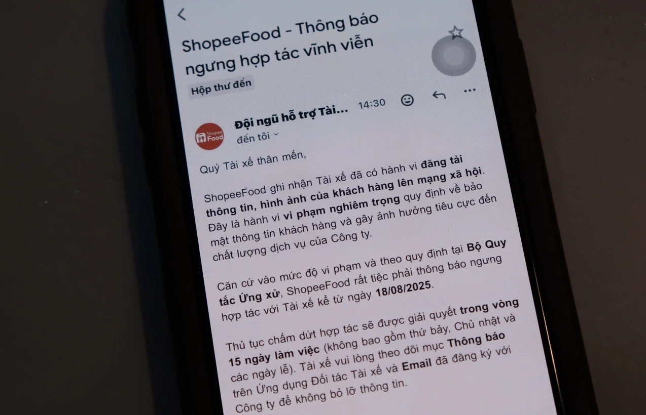 Regarding the incident that caused a stir before the post of shipper V.D. about the incident in which a female customer TT (living in Hanoi) ordered more than 30 cups of sweet soup, asking him to write each person's name on the cup corresponding to each sweet soup, Mr. PVD. said that ShopeeFood sent a notice to permanently stop cooperating with him from August 18.