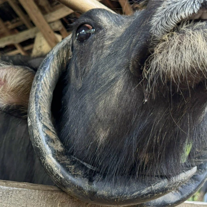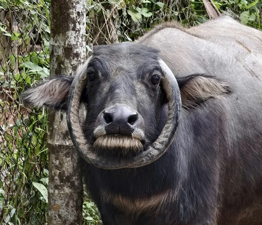 Những ngày qua, hình ảnh một con trâu cái có cặp sừng cong ngược xuống dưới, khép tròn quanh cổ lan truyền mạnh trên mạng xã hội. Nhìn ngang, cặp sừng ôm trọn gương mặt con trâu như một chiếc vòng cổ khổng lồ, tạo cảm giác vừa lạ mắt vừa khó tin.
