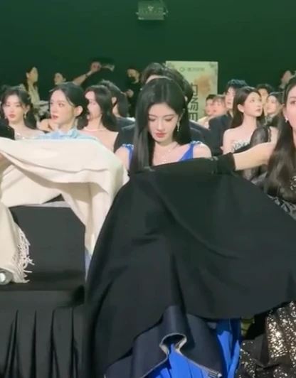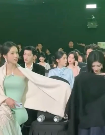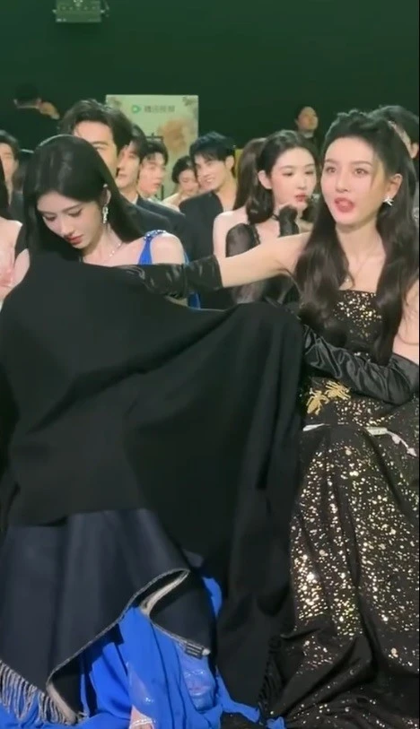 The biggest spotlight was on Ju Jingyi – a beauty often referred to as "a once-in-4000-years phenomenon." While sitting with Chen Duling and Song Zuer in the audience, netizens were surprised to see Ju Jingyi bending over, while Song Zuer used a scarf to shield herself from the cameras.