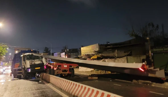 A serious traffic accident occurred in the early morning of March 27th at the southern gateway to Ho Chi Minh City, when a giant steel beam unexpectedly fell onto the road, crushing the front of a garbage truck, killing the driver instantly and causing a prolonged traffic jam on this vital route.