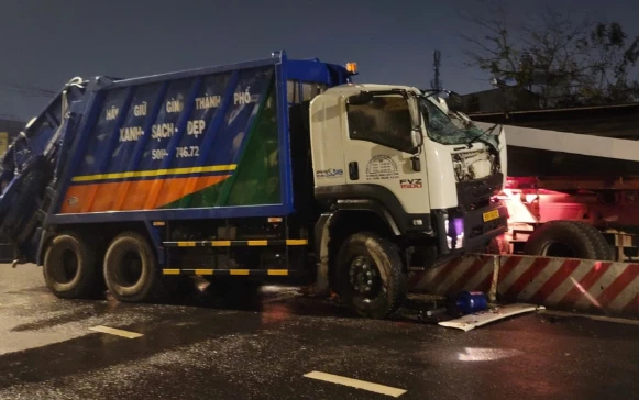 According to initial information, at approximately 2:00 AM on the same day, a tractor-trailer transporting a steel girder over 20 meters long and weighing about 10 tons was traveling on Nguyen Huu Tho Street towards the Kenh Te Bridge to enter the city center via Khanh Hoi Street. Upon reaching the base of the Kenh Te Bridge, in Tan Hung Ward, it suddenly collided head-on with a garbage truck traveling in the opposite direction.