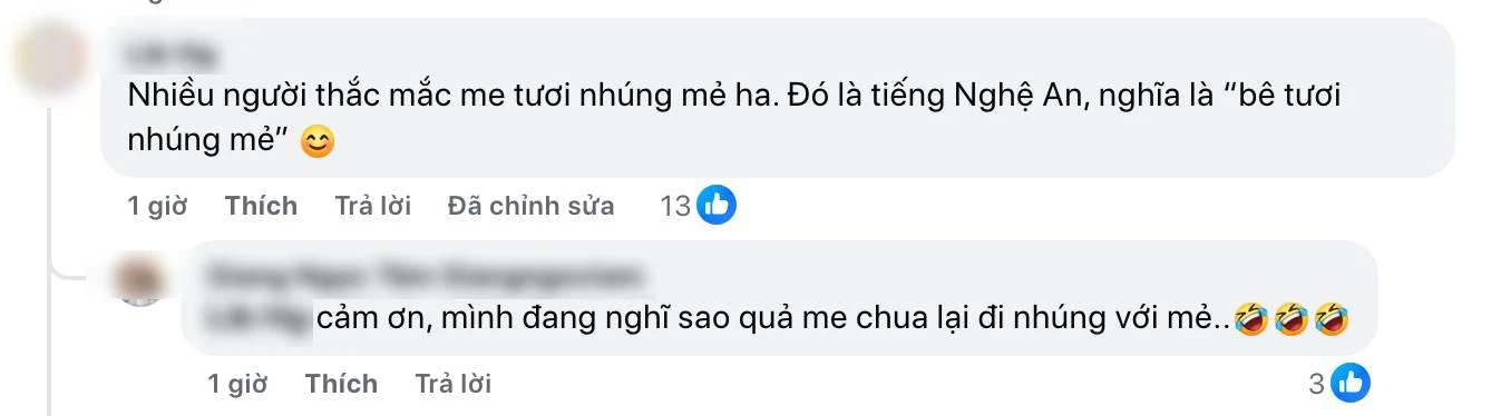 Trong số đó, món "me tươi nhúng mẻ" khiến nhiều người tò mò bởi tên gọi lạ tai. Thực chất, đây là món thịt bê tươi nhúng mẻ. Cách gọi "me tươi" là từ quen thuộc của người địa phương. Bên cạnh đó, bánh mướt cũng nhận được sự chú ý đặc biệt, bởi đây là món ăn dân dã, được xem như đặc sản của Nghệ An. Những món ăn mộc mạc nhưng đủ đầy ấy góp phần tạo nên không khí ấm cúng, gần gũi, đúng chất tiệc quê.