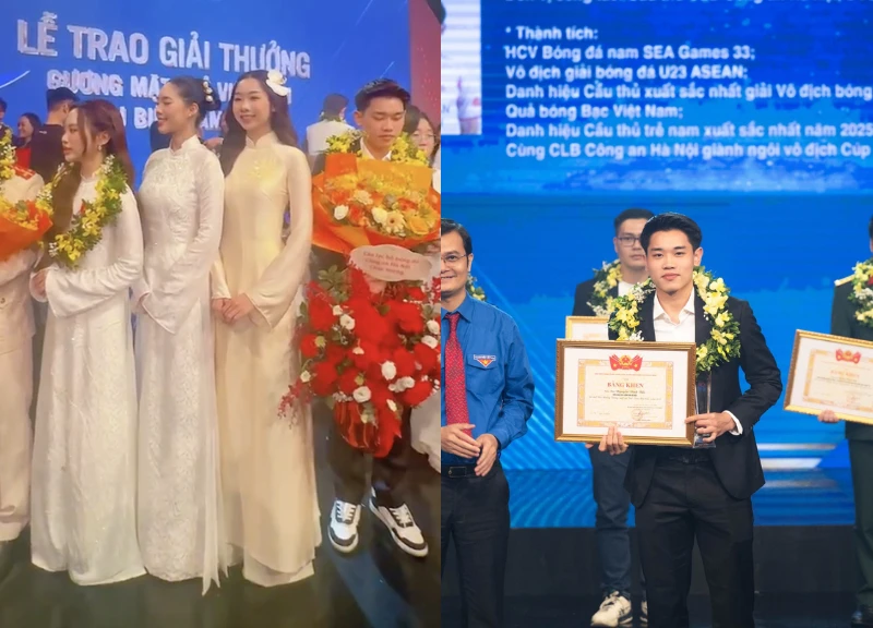 Tối ngày 25/3, tại lễ trao giải Gương mặt trẻ Việt Nam tiêu biểu, tiền đạo trẻ Đình Bắc đã chính thức được vinh danh cùng nhiều gương mặt xuất sắc khác của năm 2025. Tuy nhiên, trái ngược với hình ảnh đầy tự tin trên sân cỏ, chàng cầu thủ lại có những khoảnh khắc e dè khi đứng giữa dàn nghệ sĩ nổi tiếng để chụp ảnh. Không ít người nhận ra vẻ lúng túng và có phần "lạc lõng" của anh trong khung hình chung, điều hiếm khi thấy ở một ngôi sao trên sân cỏ như Đình Bắc.