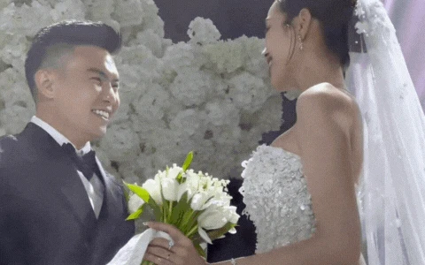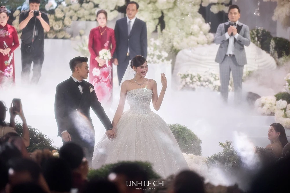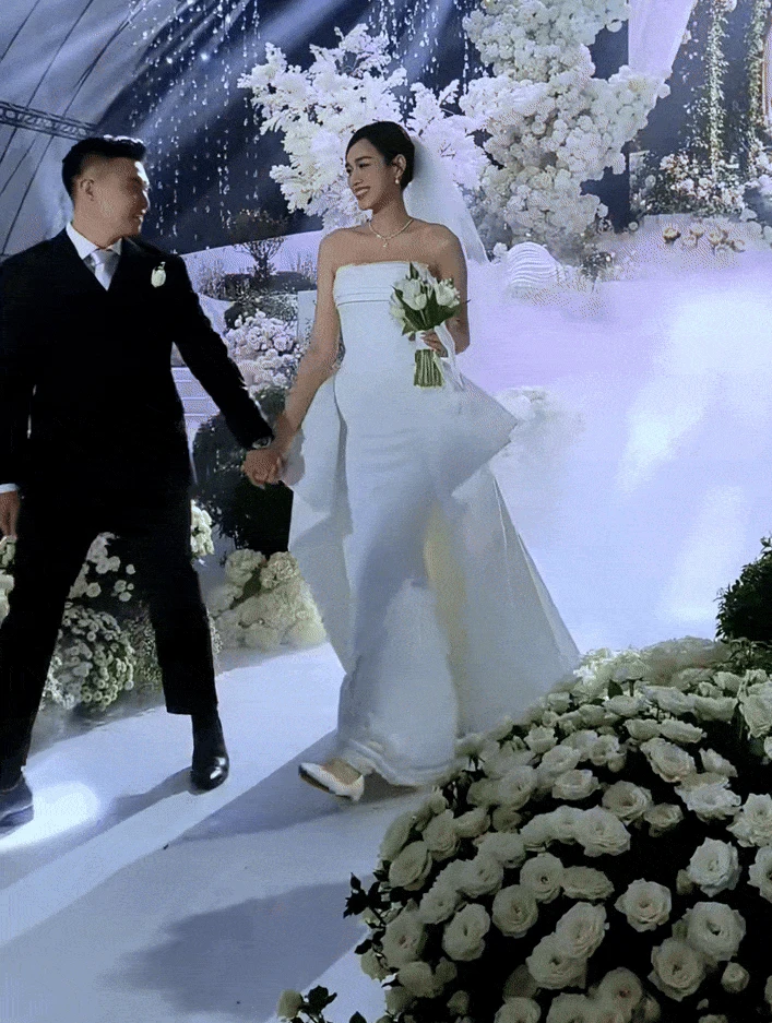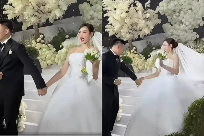 Tuy nhiên, trên lễ đường, một sự cố nhỏ đã xảy ra khi phần tà voan dài thượt bất ngờ bị vướng lại phía sau khiến Đỗ Thị Hà thoáng chút hoảng hốt khựng lại. Dù gặp khó khăn về trang phục, Đỗ Thị Hà và doanh nhân Viết Vương vẫn nắm chặt tay, không rời nhau nửa bước, thể hiện sự gắn kết và tình cảm sâu sắc.