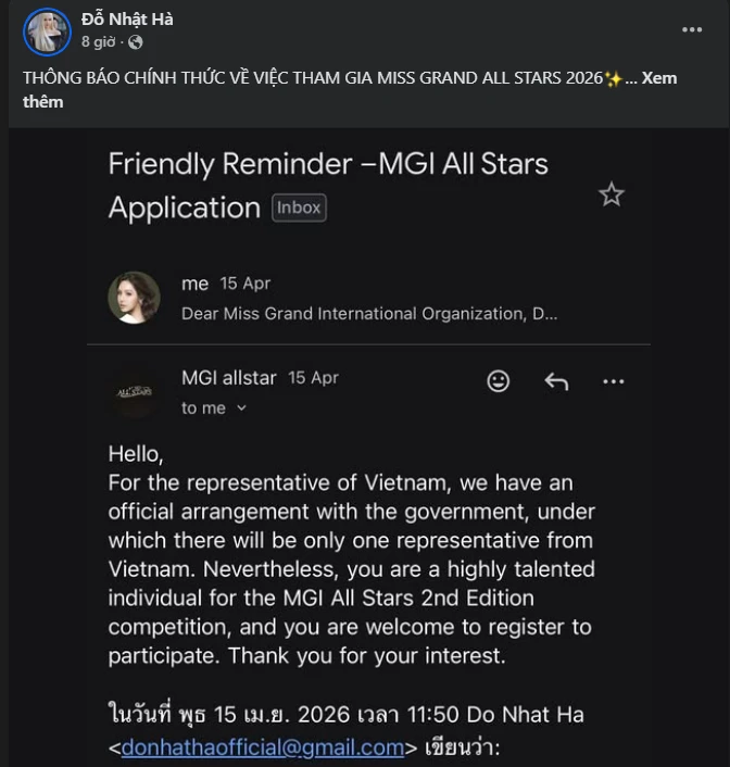 In her latest statement, Do Nhat Ha affirmed that she proactively contacted the MGI organizing committee as an independent contestant to verify the participation requirements. Contrary to rumors of being "shunned," the beauty queen stated that the organizing committee responded to her very professionally and positively. According to her, MGI explained that the selection of Vietnam's representative for the first season would follow an "arrangement"—understood as a separate mechanism or agreement—and would only recognize one representative from each country.