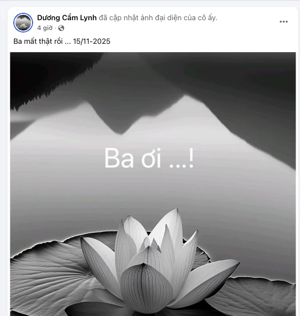 Thông tin nữ diễn viên Dương Cẩm Lynh báo tang cha trên trang cá nhân đã khiến người hâm mộ cũng như giới nghệ sĩ không khỏi bàng hoàng. Cách đây vài ngày, cô bất ngờ chia sẻ rằng cha mình đã trút hơi thở cuối cùng. Dương Cẩm Lynh đổi ảnh đại diện thành hình hoa sen trắng và nghẹn ngào viết: "Ba mất thật rồi, nhanh bất ngờ, không kịp biết gì và có sự chuẩn bị gì hết". Dòng trạng thái chất chứa đau thương lập tức thu hút sự quan tâm rộng lớn.