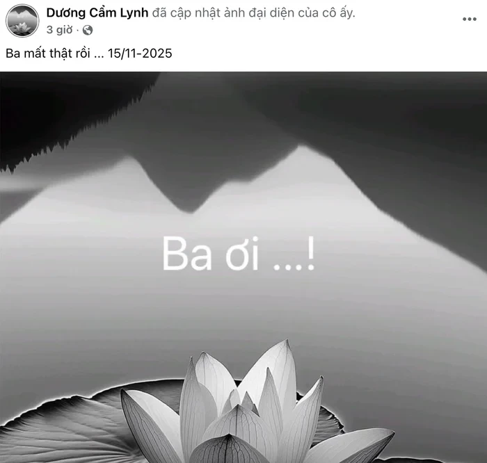 The Vietnamese entertainment industry was in an uproar when actress Duong Cam Lynh announced the sad news of her father's passing. On her personal page, she could not hide the pain of the greatest loss in her life. The actress changed her profile picture to a white lotus flower, along with a tearful message: "My father is really gone. November 15, 2025. So fast, no time to prepare anything."