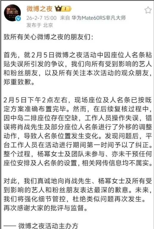 This isn't the first time Yang Mi has been embroiled in controversy due to her team's work. Previously, at the Weibo Gala on February 5th, the uproar over her central seating position (C-position) also highlighted the actress's tendency to dominate public opinion early on. Even before the show was settled, topics asserting her status had already topped search trends, leading the organizers to issue an apology for the seating arrangement error.