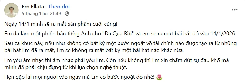 Mạng xã hội những ngày qua liên tục bàn luận xoay quanh bài đăng mới nhất của Em Ellata – nam ca sĩ indie từng gây chú ý với bản hit Yesterday. Theo chia sẻ, ngày 14/1 tới sẽ là thời điểm anh phát hành sản phẩm âm nhạc cuối cùng, phiên bản tiếng Anh của ca khúc Đã Qua Rồi. Sau đó, nếu không có bước ngoặt rõ ràng về mặt tài chính, Em Ellata khẳng định sẽ dừng toàn bộ hoạt động âm nhạc.