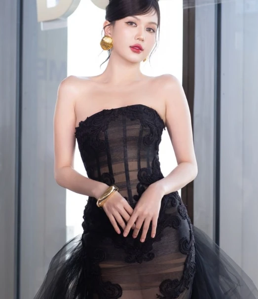 When placed next to Ngoc Trinh's appearance, many viewers commented that Tran Thanh's sister looked "slashed" and more surprising. Ngoc Trinh landed on the red carpet with a black strapless design, light penetrating material but delicately processed, somewhat more discreet and restrained than the image of the usual "lingerie queen". She even admitted that she had just gained 2kg (already 54kg), so she had to choose a discreet dress and tighten her body.