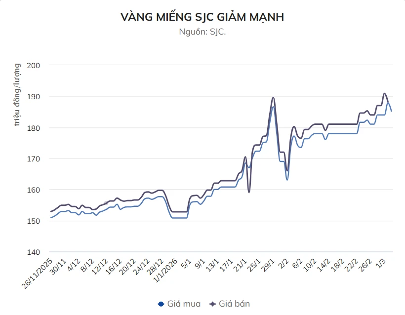 Opening the trading session on the afternoon of March 3, the price of SJC gold bars made investors "sit still" when they were simultaneously adjusted sharply down by businesses. At large systems, the buying - selling price is currently only around 185.2 - 188.2 million VND/ton, "evaporating" up to 2.7 million VND compared to the morning. Meanwhile, the price of gold rings also retreated deeply to the mark of 188.2 million VND/ton.