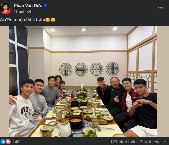 Trên trang cá nhân với hơn 1,4 triệu người theo dõi, tiền vệ Phan Văn Đức mới đây đã chia sẻ loạt hình ảnh ghi lại buổi tối ấm cúng bên các đồng đội cũ của tuyển Việt Nam, gồm những gương mặt quen thuộc như Nguyễn Quang Hải, Vũ Văn Thanh, Trần Đình Trọng, và đặc biệt là sự góp mặt của HLV Park Hang-seo. Kèm theo những bức ảnh, Văn Đức dí dỏm viết: "Ai đến muộn thì 5 trăm", tạo nên không khí thân mật và tràn đầy tiếng cười.