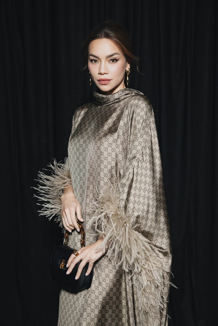 Not only did she appear alongside other Vietnamese stars at the event, Ho Ngoc Ha also attracted attention with her new fashion style at another recent Gucci event – wearing a modest, head-to-toe designer outfit. Unlike her usual glamorous, figure-flaunting image, the loose-fitting, high-necked, long-sleeved outfit with the signature monogram pattern exuded a mysterious and sophisticated aura. Many viewers commented that the singer still maintained her striking presence despite not using the revealing elements often seen in her outfits.