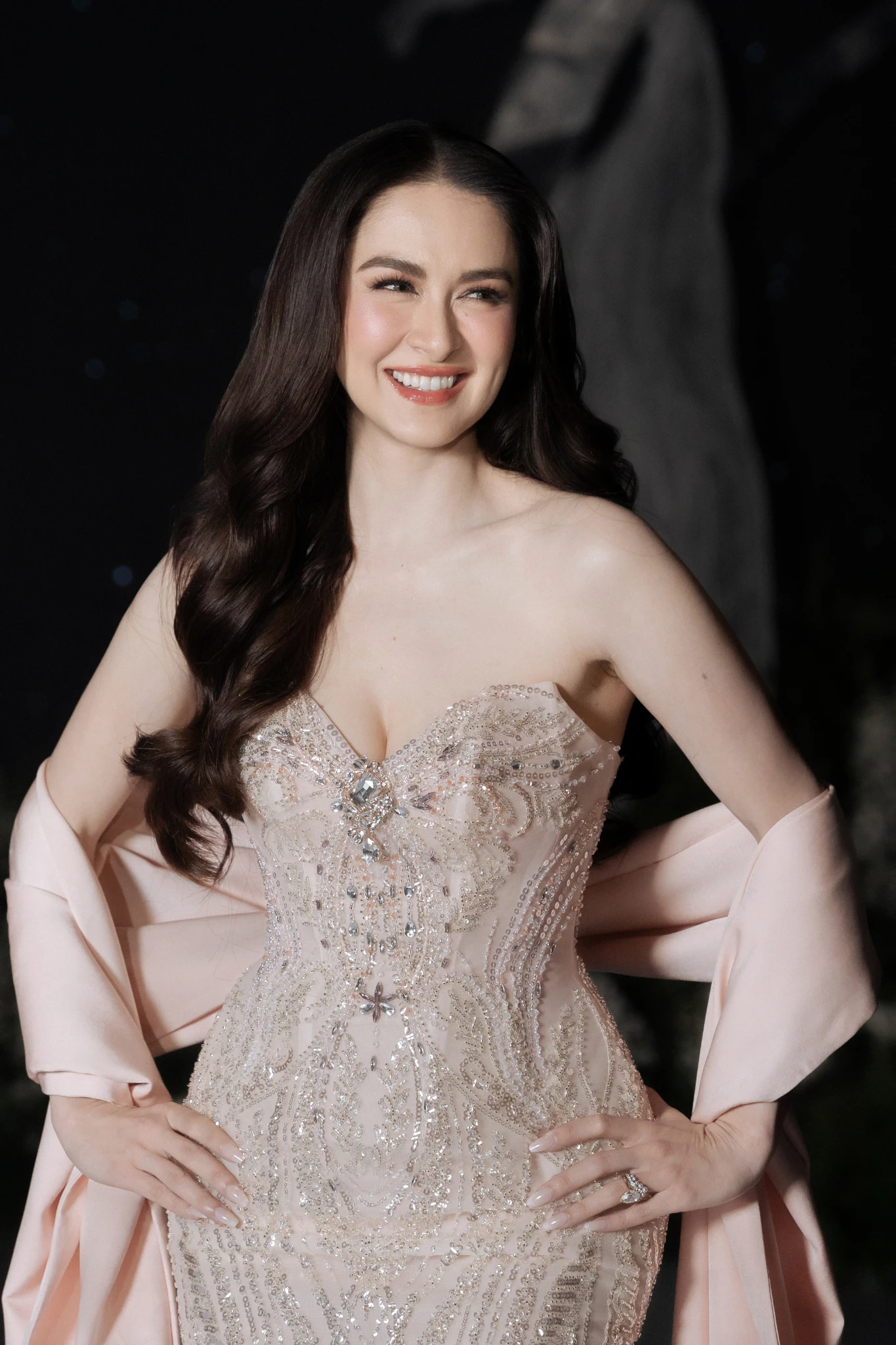 The appearance of Marian Rivera clearly overshadowed the efforts of the Vietnamese stars, including the cold charisma of Ho Ngoc Ha or the radiant beauty of Thieu Bao Tram. She chose a tight-fitting pastel pink dress with intricate embellishments, highlighting her seductive body and flawless white skin. At the age of 41 and a mother of two, Marian's beauty still maintains its peak, showing no trace of time. Her luxurious, sweet, and powerful aura overshadowed all the stars present at the event.