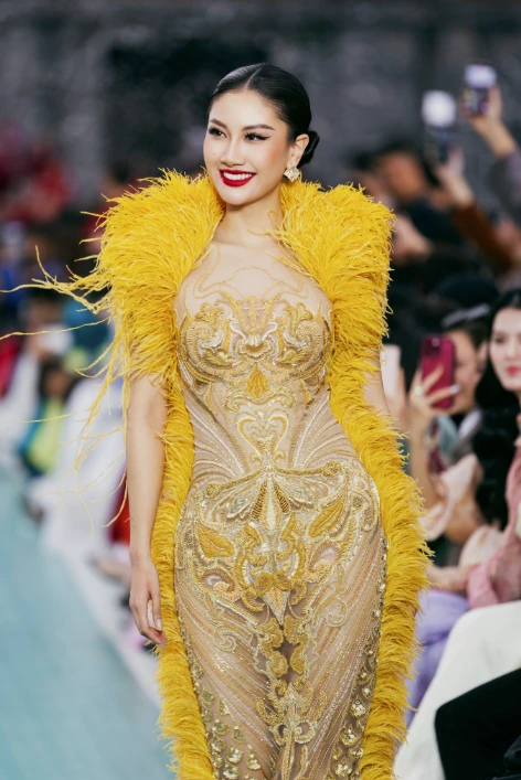 Among them, the appearance of Miss Phuong Linh â Miss Cosmo Vietnam 2025 â is the most awaited. She took the position at the end of the show, appearing in a delicately attached nude design, dotted with soft feathers. Under the lights and the warm cheers of the audience, Phuong Linh made her mark with her confident demeanor, flexible catwalk steps and luxurious demeanor. Many commented that she gave a "full" performance both technically and emotionally.