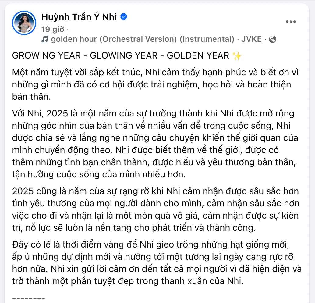 Khép lại năm 2025, Ý Nhi chọn cách nhìn lại hành trình đã qua bằng một tâm thư dài, nhẹ nhàng nhưng đầy chiều sâu. Nàng hậu chia sẻ những thay đổi tích cực của bản thân sau một năm nhiều trải nghiệm, trân trọng từng điều nhỏ bé trong cuộc sống.