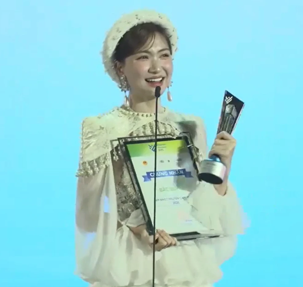 The first moment the singer from Bac Ninh stepped onto the stage was when her name was called in the Individual for the Community category, sharing the prize with creator Vinh Thich An Ngon. Holding the prestigious trophy in her hand, Hoa Minzy could not hide her emotion and burst into tears, sharing that this was a prize with special meaning, surpassing mere artistic awards.