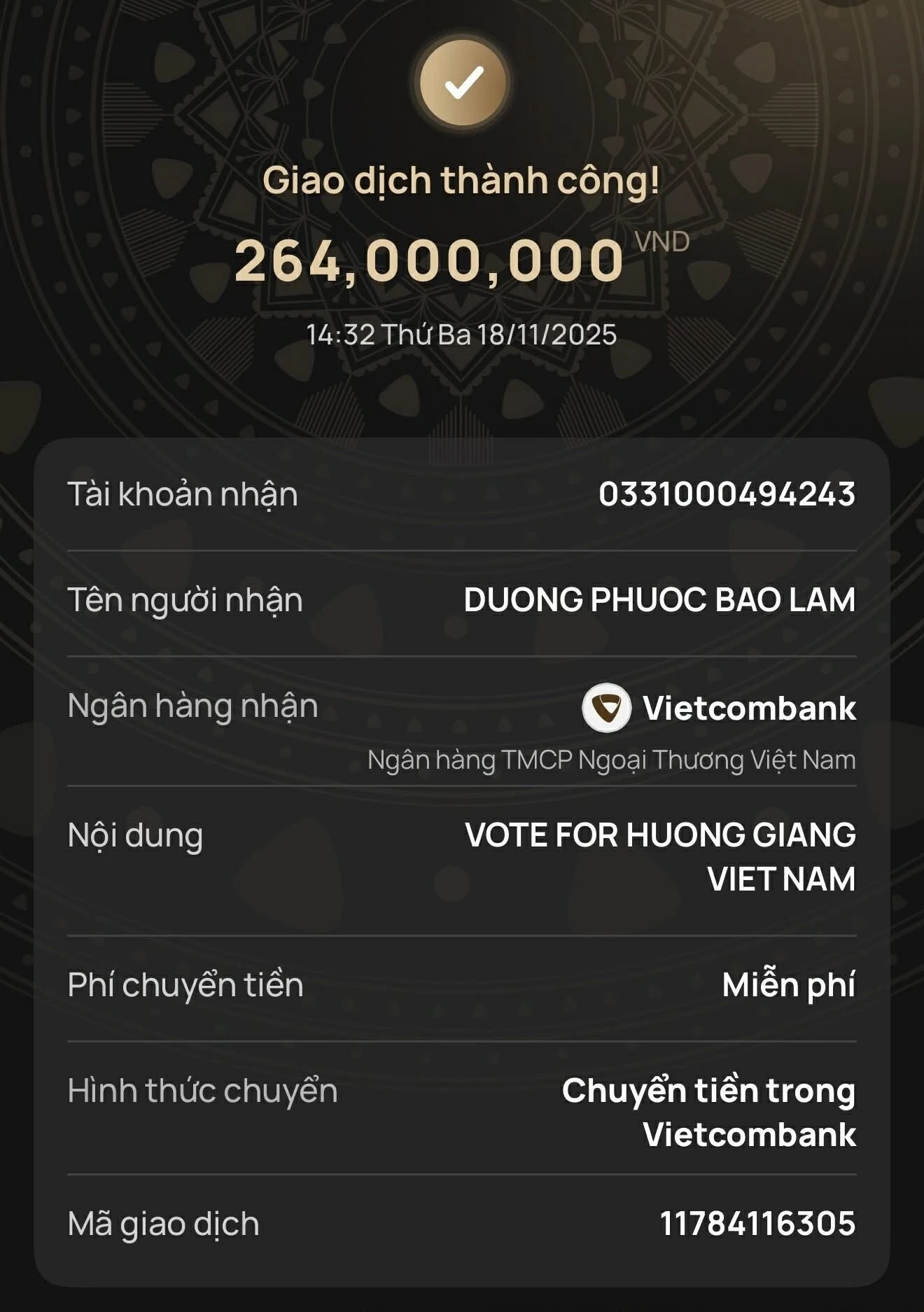 Theo giá thị trường hiện tại, số bình chọn này tương đương khoảng 264 triệu đồng – con số không hề nhỏ. Tuy nhiên, giọng ca Bắc Bling không hề ngần ngại mà chuyển khoản "một phát" cho ê-kíp Hương Giang. Hành động đầy nghĩa tình này khiến cộng đồng mạng không khỏi trầm trồ, vừa ngưỡng mộ tinh thần dân tộc vừa cảm phục tình bạn của hai nữ nghệ sĩ.