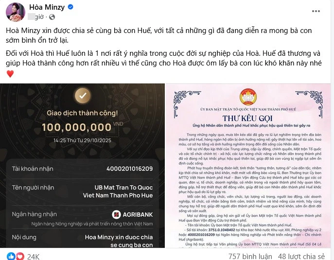 The amount of 100 million VND was transferred directly by Hoa Minzy to the account of the Vietnam Fatherland Front Committee of Hue City, demonstrating transparency and responsibility in charity work.