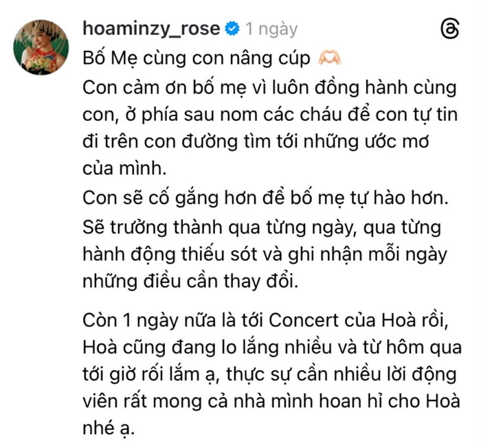 The post subsequently received mixed reactions from the online community, with some opinions suggesting that Hoa Minzy's wording was inappropriate. The singer of "Bac Bling" immediately deleted the first post and posted a new one in the form of a heartfelt letter to her parents. The long text message focused on personal messages and a call for "joyful acceptance."