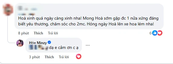 Mới đây, Hòa Minzy gây chú ý khi chia sẻ hình ảnh tham dự một lễ cưới. Phía dưới bài đăng, một cư dân mạng gửi lời chúc: "Hòa xinh quá, mong Hòa sớm gặp được một nửa xứng đáng, biết yêu thương và chăm sóc cho hai mẹ con. Hóng ngày Hòa lên xe hoa lắm nhé".