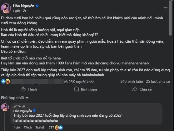 Trước đó, sau khi tham dự đám cưới của Á hậu Chế Nguyễn Quỳnh Châu, Hòa Minzy bất ngờ chia sẻ về kế hoạch... thử lập danh sách khách mời nếu sau này mình tổ chức hôn lễ. Bài viết hài hước của cô nhanh chóng thu hút sự chú ý:
