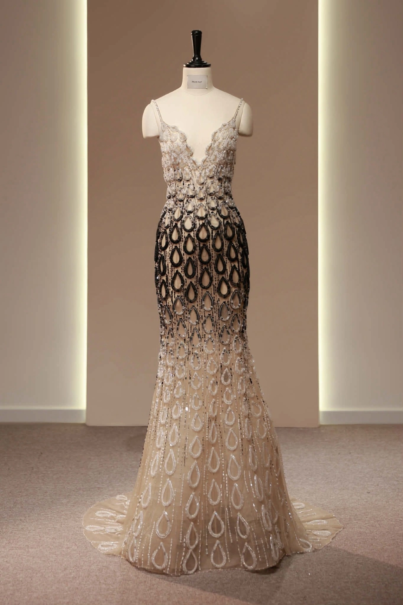 The dress uses nude - metallic black as the main tone, with the upper body decorated with crystals in a teardrop motif, creating a sparkling effect when the stage lights shine on it. The color gradient panels along the body of the dress are cleverly arranged, helping the beauty queen's figure look slimmer and more graceful.