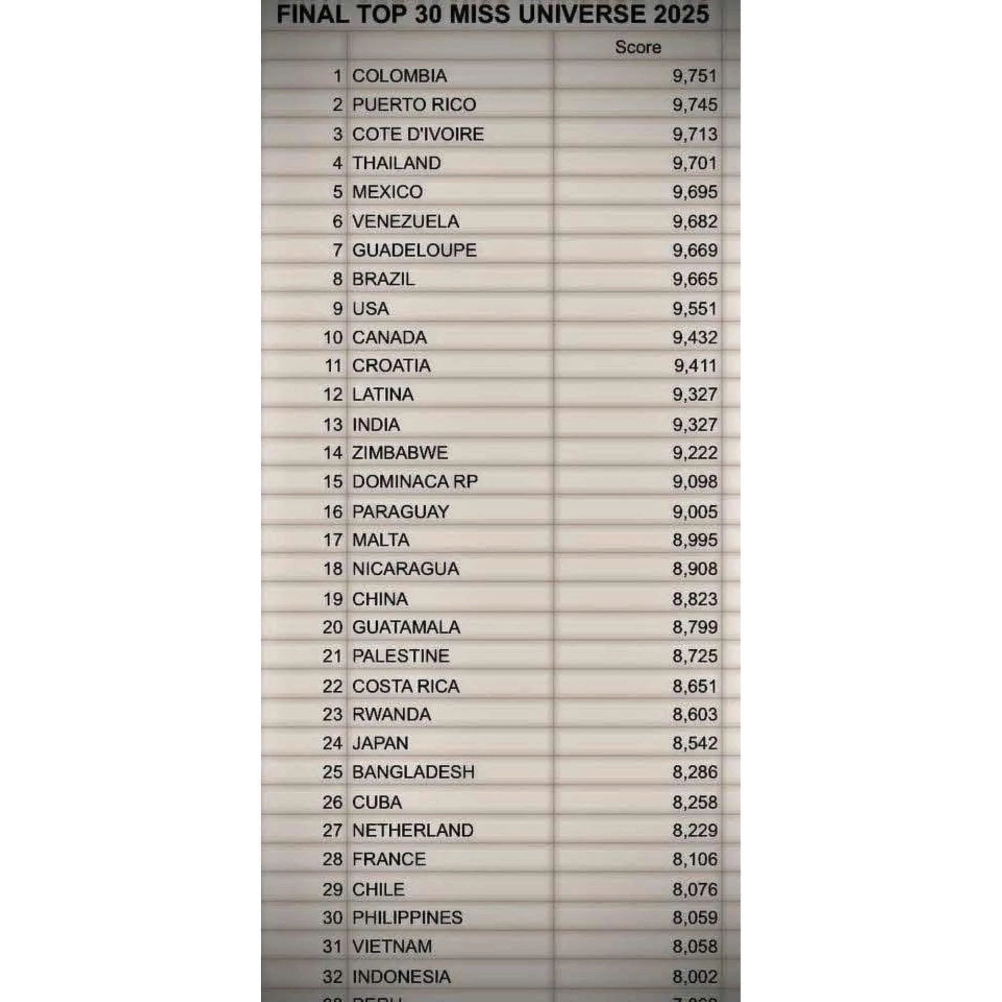 After the final night, social networks spread a scoreboard that was said to be of the top 30, in which Vietnam ranked 31st. However, many people thought that this was just a fake scoreboard because Miss Universe does not announce scores. The appearance of a scoreboard made in an unprofessional Excel file made the audience even more suspicious and judged that this was just a viral product to attract attention.