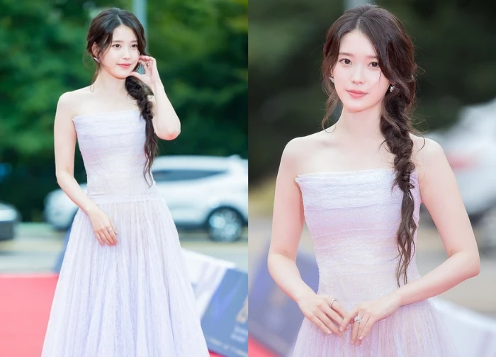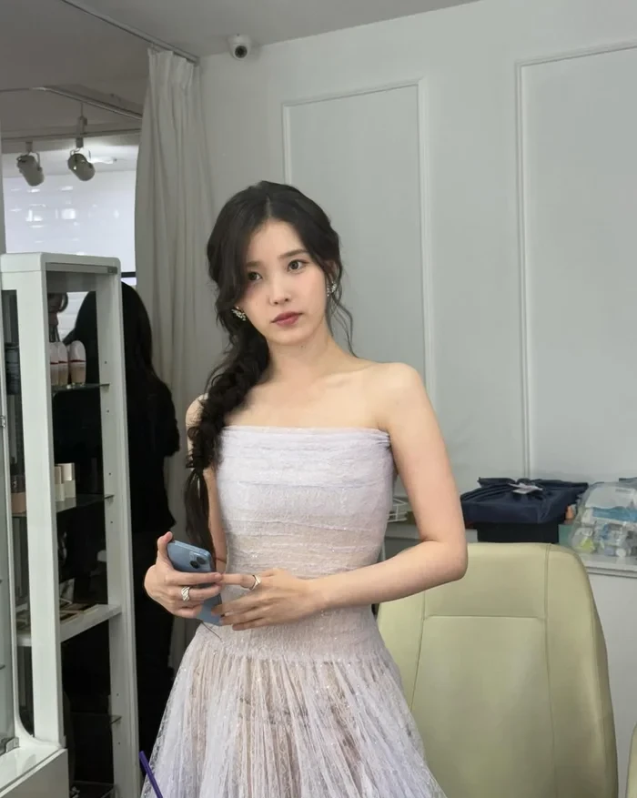 In the photos shared, IU wears a delicate evening dress design. The dress with a gentle light purple color, using thin chiffon material that sees through, especially the skirt is covered with a glittering metallic sheen, creating a fantastical visual effect like the morning mist.