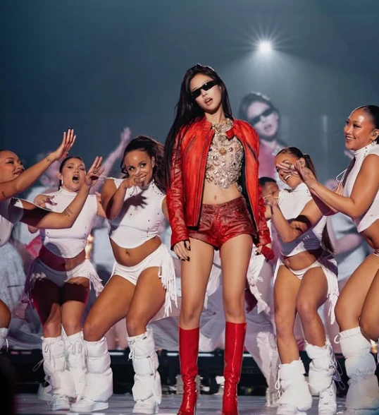 Chưa dừng lại ở đó, "Chanel sống" tiếp tục biến hóa đầy quyền lực với áo khoác da đỏ rực rỡ, bên trong là bộ jumpsuit đính đá lấp lánh dưới ánh đèn sân khấu. Thần thái sắc sảo cùng khả năng "cân" mọi loại trang phục khó nhằn đã giúp Jennie một lần nữa khẳng định vị thế "Fashion Icon" không thể thay thế của K-pop. Mỗi bước đi, mỗi cú xoay người của nữ idol đều toát lên sức hút mãnh liệt, khiến truyền thông quốc tế phải dành nhiều mỹ từ để ca ngợi diện mạo "chấn động" này.