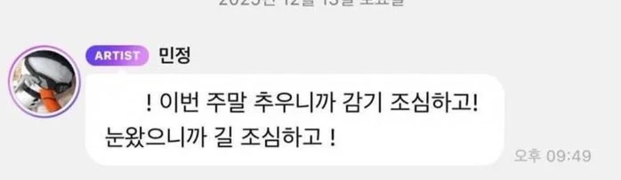 At the same time, Winter (aespa) also broke the ice with a message sent to fans via the Bubble platform. The idol's message was caring and reassuring, reminding fans to take care of their health in the cold weather: "It will be very cold this weekend, so remember to be careful not to catch a cold! It's snowing, so be careful when driving! Don't catch a cold. Remember to eat warm food!"