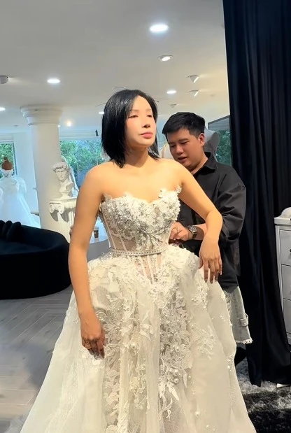 The internet recently couldn't help but be stirred by a clip recording the moment comedian Kha Nhu appeared at designer Lam Lam's wedding dress shop to try on a pure white dress.