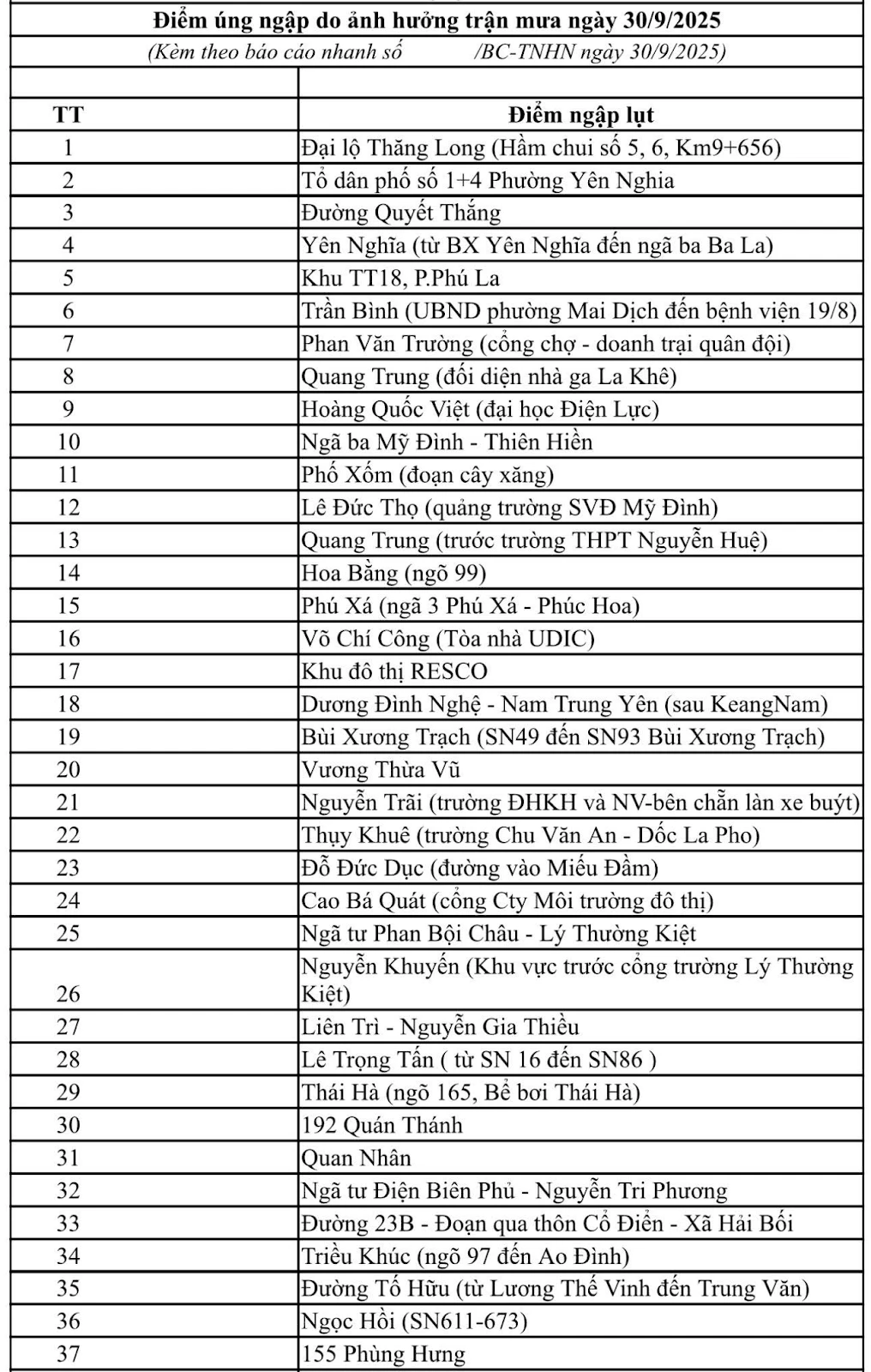 Not only riverside areas, Hanoi's inner city is also facing flooding. According to the report of Hanoi Drainage Company Limited at 7am on September 30, rain due to the influence of storm Bualoi started from the night of September 29, with rainfall measured at some locations such as Tay Mo 169mm, Phu Luong 118mm, Xuan Mai 198mm. Water levels in inner city rivers also recorded high levels: To Lich River (Hoang Quoc Viet) 3.85m; Thanh Liet Dam 2.90m; Lu River 3.01m; Kim Nguu River 3.01m.