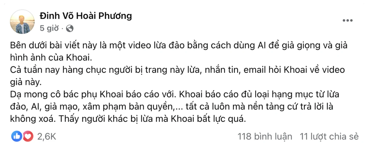 "Bên dưới bài viết này là một video lừa đảo bằng cách dùng AI để giả giọng và giả hình ảnh của Khoai. Cả tuần nay hàng chục người bị trang này lừa, nhắn tin, email hỏi Khoai về video giả này," Khoai Lang Thang chia sẻ.