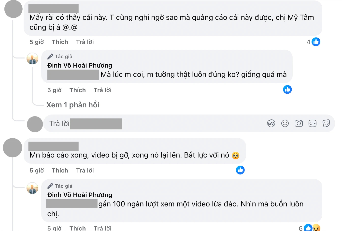 Anh bức xúc cho biết: "Dạ mong cô bác phụ Khoai báo cáo với. Khoai báo cáo đủ loại hạng mục từ lừa đảo, AI, giả mạo, xâm phạm bản quyền,... tất cả luôn mà nền tảng cứ trả lời là không xóa. Thấy người khác bị lừa mà Khoai bất lực quá."