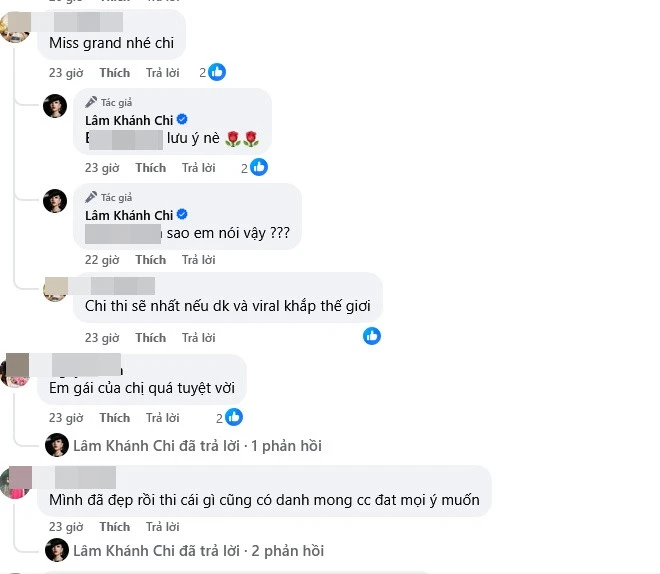 In a short time, the post received nearly 7,000 likes and hundreds of comments. The majority of viewers expressed support, saying that Lam Khanh Chi's decision was bold but commendable. Many even enthusiastically suggested suitable beauty pageants for her to consider. Notably, when one netizen suggested, "Miss Grand, how about that?", Lam Khanh Chi responded briefly but cryptically: "Note this." This response led many to believe that Miss Grand might be a serious option the beauty queen is considering.