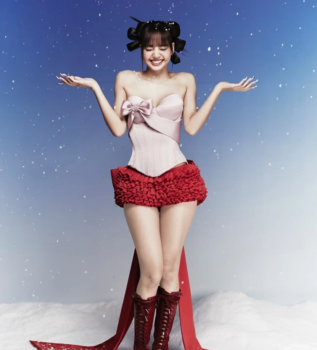 Trong bộ ảnh, "em út" BLACKPINK diện chiếc áo corset tông hồng pastel thắt nơ nữ tính phối cùng chân váy ngắn sắc đỏ đặc trưng của mùa lễ hội. Sự kết hợp tinh tế giữa các gam màu nồng ấm cùng đôi giày cao gót có thiết kế lạ mắt đã giúp Lisa khoe trọn vóc dáng mảnh mai nhưng vẫn giữ được nét kín đáo, thanh lịch. Ngay lập tức, cộng đồng mạng đã dành "cơn mưa" lời khen cho diện mạo này. Nhiều khán giả thừa nhận họ suýt "không nhận ra" thần tượng vì hình ảnh này quá đỗi dịu dàng, khác biệt hoàn toàn với một Lisa bùng nổ, rực cháy thường ngày.