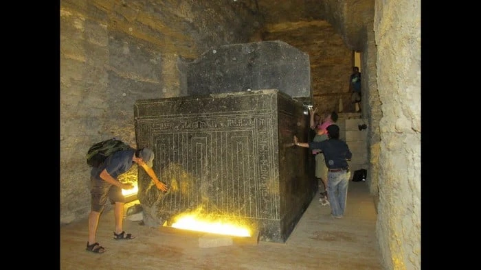 Many may therefore wonder whether a similar lighting mechanism could have been used at the Serapeum in pre-dynastic times. When granite sarcophagi are subjected to mechanical stress, an electrical charge is generated. The charges are typically dispersed toward the ground surface. When the charges reach the surface, they ionize air pockets above the ground and may have lit up the sky above Saqqara.
